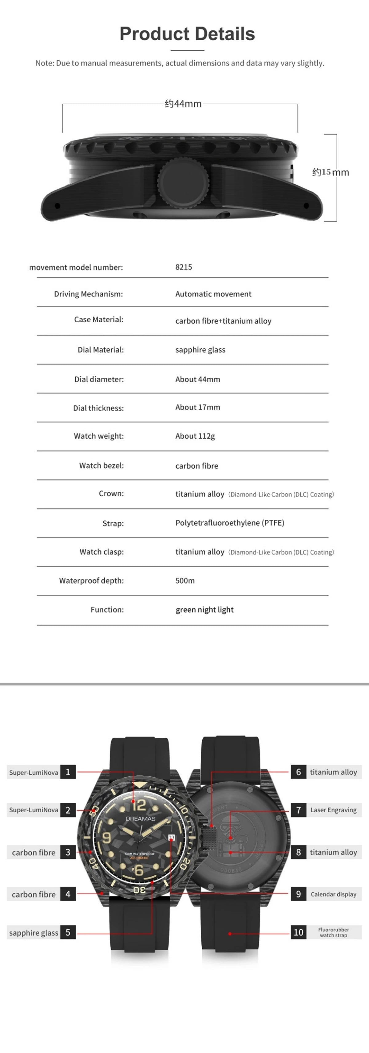 DREAMAS Men's Carbon Fiber Automatic Mechanical Diving Watch Swiss Luminous 500m Waterproof Gradient cold grey D0390G3