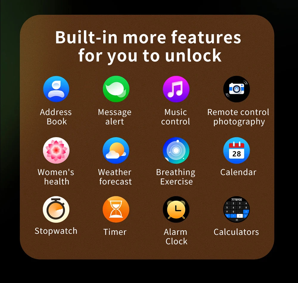 Function: Passometer,fitness tracker,sleep tracker,Message Reminder,Call Reminder,Answer Call,REMOTE CONTROL,Push Message,Chronograph,Alarm Clock,World Time,Permanent Calendar,Month,Heart Rate Tracker,Calendar,Countdown,Calculators