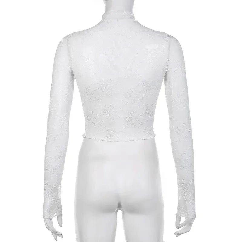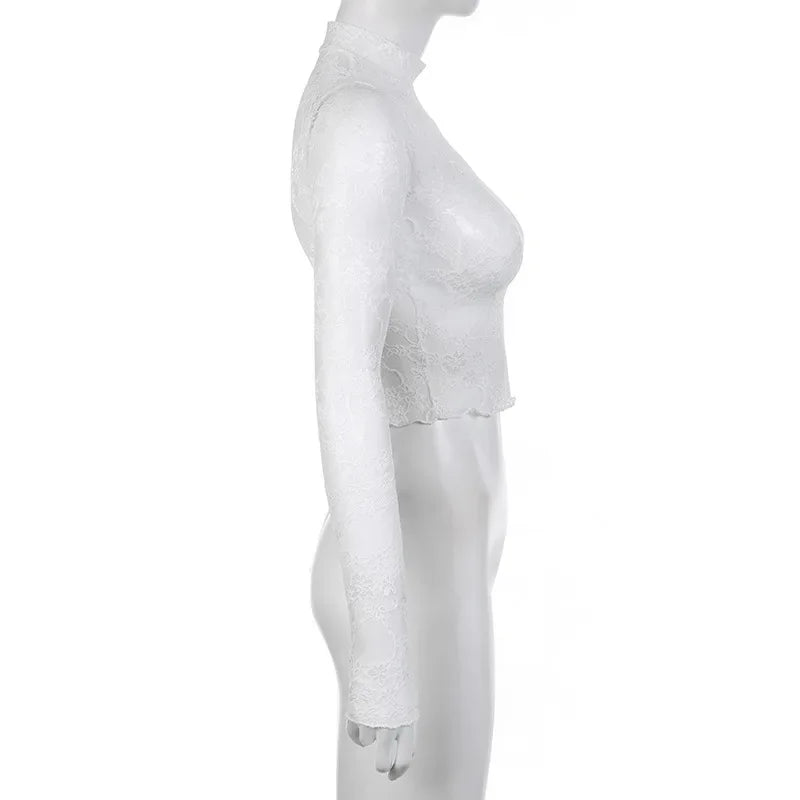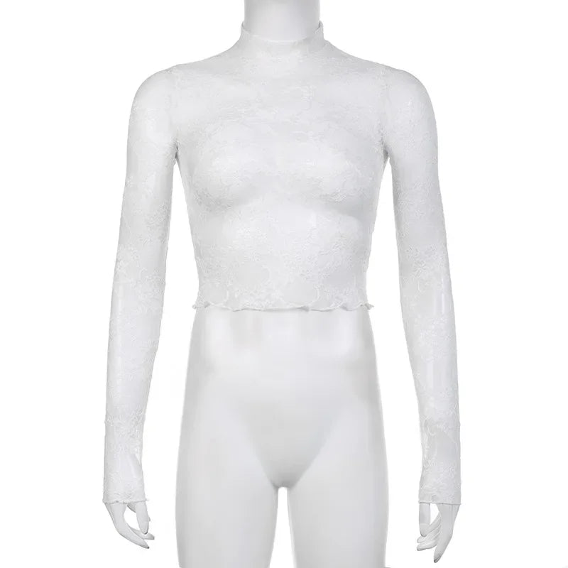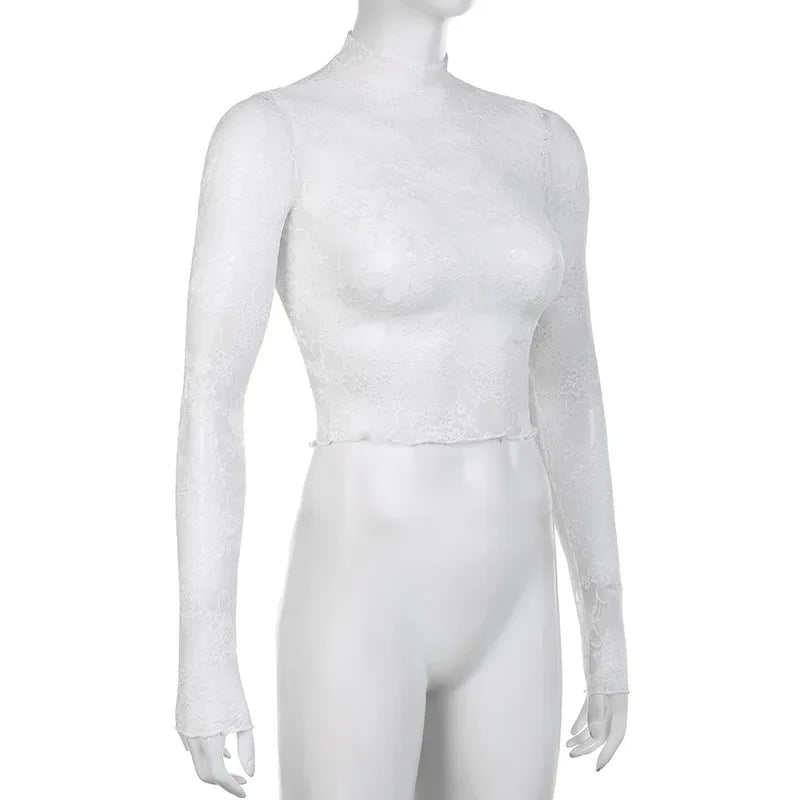 Lace Blouse Shirts Summer Women Turtleneck Long Sleeve See Through Lace Patchwork Thin Tops